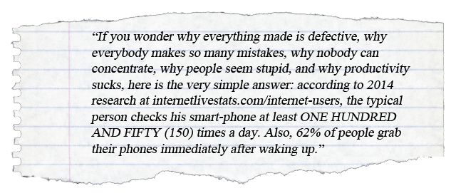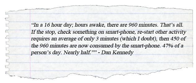 Before I move on and share my 7 step foolproof productivity system with you I want to share with you a snippet of a fax I got from Dan Kennedy a few months back. This may seem mindbogglingly insane but it’s true. The majority of your tie is being EATEN by your smart phone.